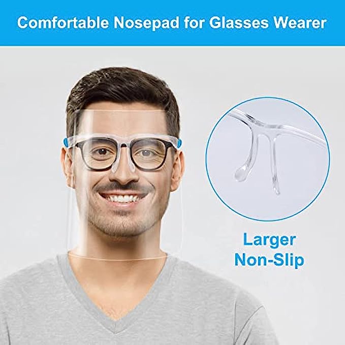 • 【10 PACK of face shield】Durable, lightweight, and comfortable protective face shields that are made with ultra-clear elastic and thick plastic. Each face shield contains an individual acrylic glasses frame, so you can get 10 complete Face shields with High quality glasses frames. When wearing glasses over your ears and on your nose bridge, this face shield protecting you will provide good protection as well as comfort. One size fits all and could be shared with families and friends.