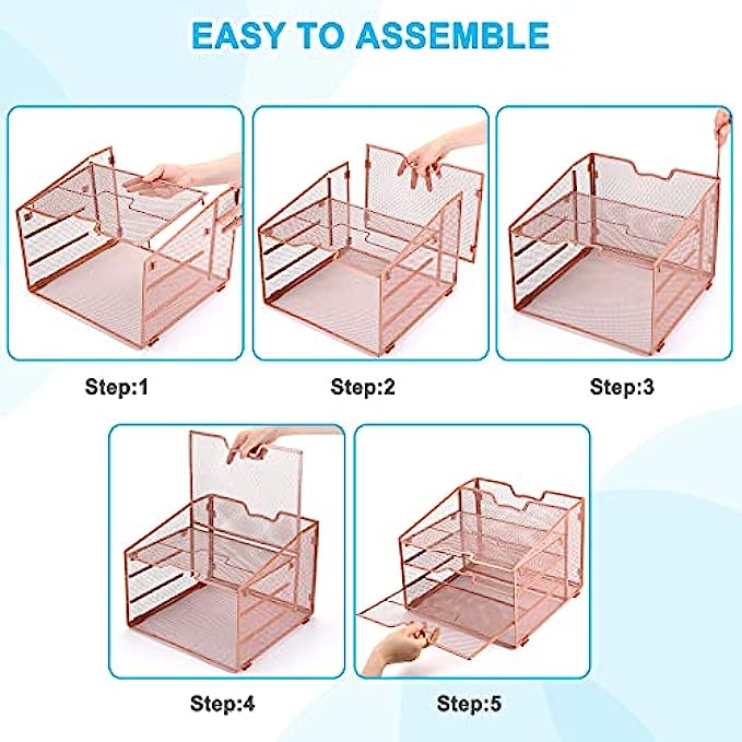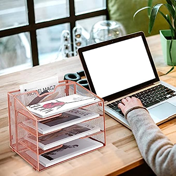 Reliatronic Mesh Desk Organizer, Metal 5 Compartments Organizer with 4 Horizontal Letter Trays and 1 Upright Section for Letters, Folders, Files, Documents and Desk Accessories, Rose Gold